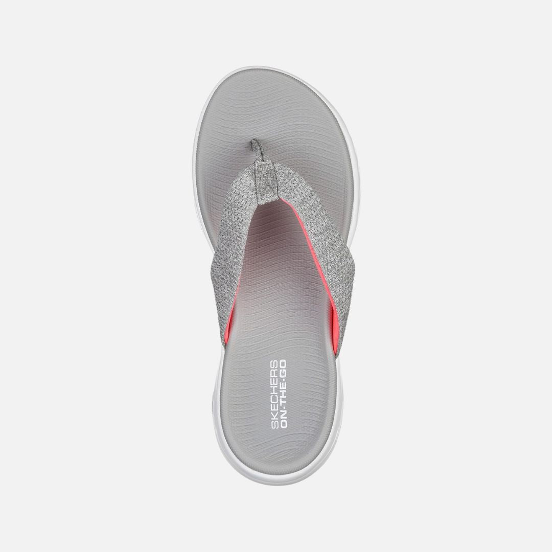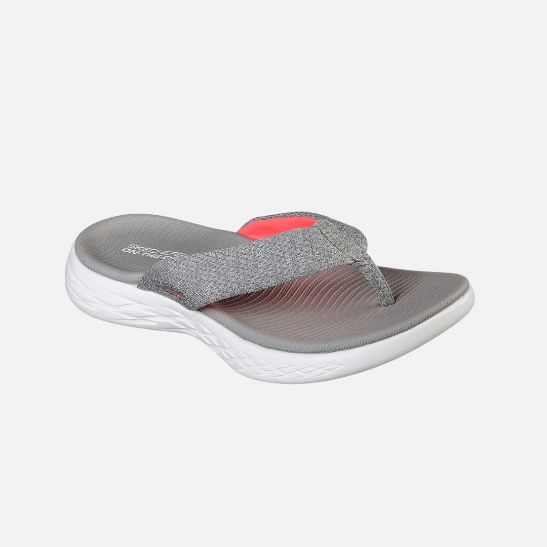 Choose the perfect sandal for summer comfort and style in the Skechers On the GO 600 - Preferred sandal. Soft knit fabric in a sporty casual comfort 3 point thong sandal with Goga Max Contour Footbed and Skechers GOrun 600 design sole.